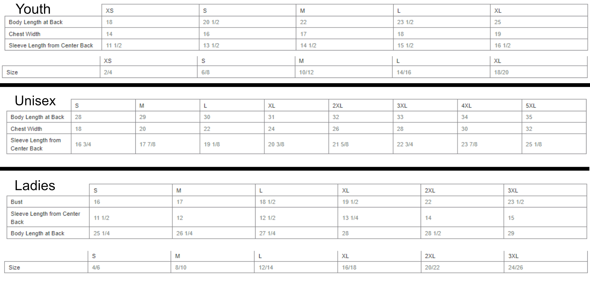 Youth XS Youth S Youth M Youth L Youth XL S M L XL 2XL 3XL 4XL 5XL Ladies S Ladies M Ladies L Ladies XL Ladies 2XL Ladies 3XL